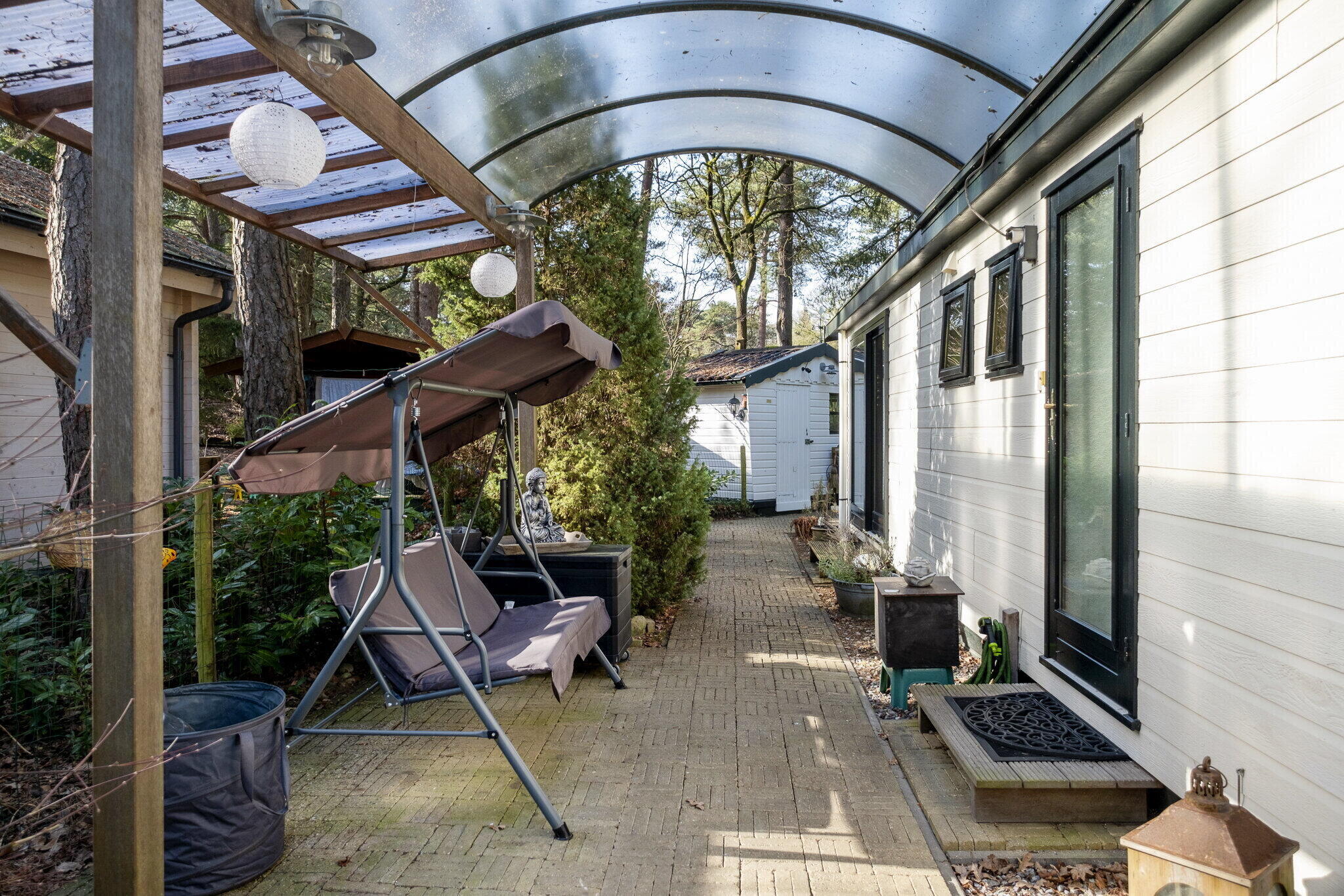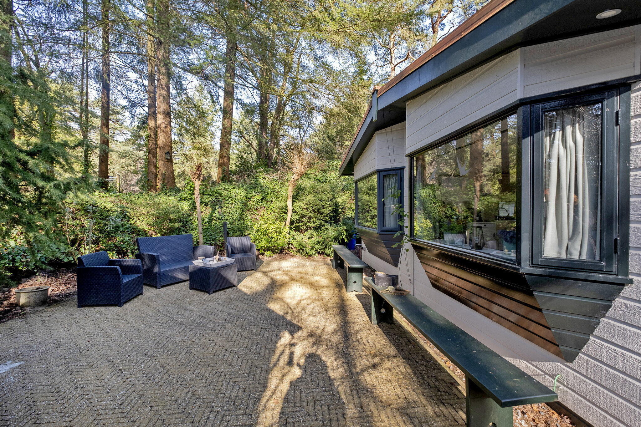 Rondom het chalet is een keurige tuin aangelegd en doordat het chalet aan de voet van een heuvel staat is er veel privacy. Dankzij de ligging van het park grenst het chalet vrijwel direct aan het Nationaal Park, met zijn bossen en zandverstuivingen.