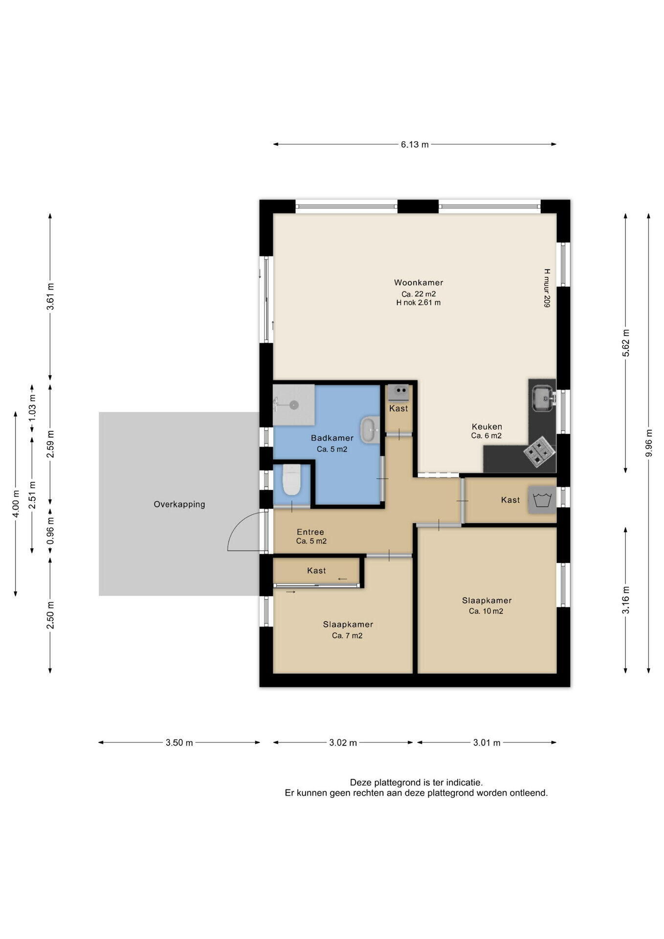 Entree/hal die een centrale rol vervult. De ruime woonkamer (ca. 22 m²) heeft veel natuurlijk lichtinval en is voorzien van een schuifpui naar het terras. De open keuken is uitgevoerd met diverse inbouwapparatuur zoals o.a. een gaskookplaat, afzuigkap, oven en koelkast. Vanuit de hal zijn twee slaapkamers (ca. 10 m² en 7 m²) bereikbaar, evenals de badkamer. Deze is voorzien van een douche, wastafelmeubel en designradiator. Verder is er een separaat toilet en twee vaste kasten waarvan een fungeert als CV opstelplaats en de andere als wasruimte met witgoed aansluiting.
